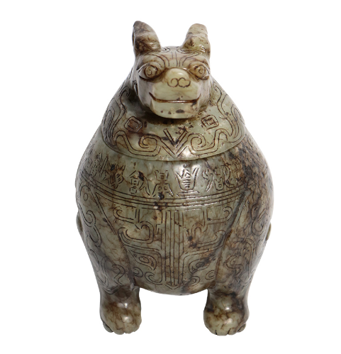 西周玉雕以圓雕異獸聞名,善抓「動態」與「力感」;夔鳳紋源於青銅器,以幻化神鳥為原型,戰漢盛行。此梟尊將兩者融合:器型仿青銅酒尊,夔鳳紋飾延續上古神話符號。漢代「玉為王者之石」,此玉尊僅貴族可擁有,不僅見證漢代禮制等級,更承載神話信仰與酒文化内涵,是研究漢代社會文化的珍貴實物。