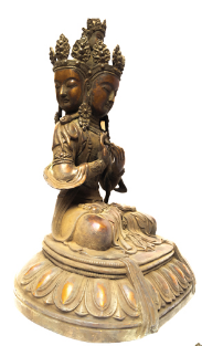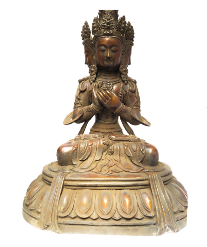 造像细节更暗藏信仰密码:四面佛祖面目庄严大气,传递 “悲智双运” 的神性;宝冠威严、璎珞华贵,既符合明代审美中的庄严范式,也象征佛的圆满功德;结跏趺坐的姿态与飘逸衣带,兼具神圣性与灵动美,是明代 “汉藏融合” 造像风格的典型表现,其文化价值远超普通宗教器物。