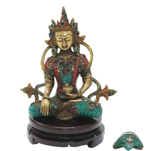 – 宝石镶嵌:造像身上开凿规整槽孔,镶嵌松石、玛瑙等天然宝石,全身装饰满嵌红绿两色宝石——宝石选材色泽浓郁、质地纯净,镶嵌工艺采用「包边嵌」与「槽嵌」结合,宝石稳固不松动,与鎏金铜胎形成「金翠交辉」的视觉效果。这种繁复却不失精致的嵌宝工艺,既强化了度母像的华贵庄严,又体现明代「材美工巧」的工艺追求。