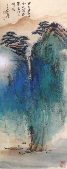 張大千作為20世紀中國畫壇巨匠,晚年開創潑墨潑彩技法,將中國傳統山水與西方抽象藝術巧妙融合,開創山水畫新境界。本幅《萬壑有聲圖》款識「萬壑有聲含萬籟,數峰無語立斜陽,大千張爰」,鈐印「張爰」「大千居士」「大千豪發」,款印齊全,是其藝術成熟期的代表作。詩句題跋與畫面意境相得益彰,既承襲文人畫「詩書畫印」合一的傳統,又以突破性技法展現時代審美,體現張大千對宇宙自然的深刻感悟與藝術創新精神。