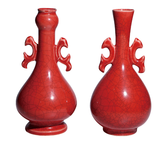 柴窑瓷器因存世稀少、工藝極致,向來是高古瓷收藏頂級標的,紅釉對瓶更是鳳毛麟角: