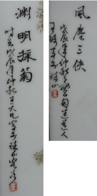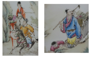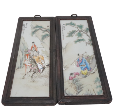 民國時期景德镇「珠山八友」開創了瓷繪藝術的新風貌,其中王琦、王大凡的人物瓷板畫更是市場炙手可熱的收藏精品。這組「渊明采菊」與「風塵三俠」二條屏,匯聚兩位大師的藝術精髓,兼具歷史文化底蘊與精湛工藝,是民國瓷板畫收藏的典範之作。