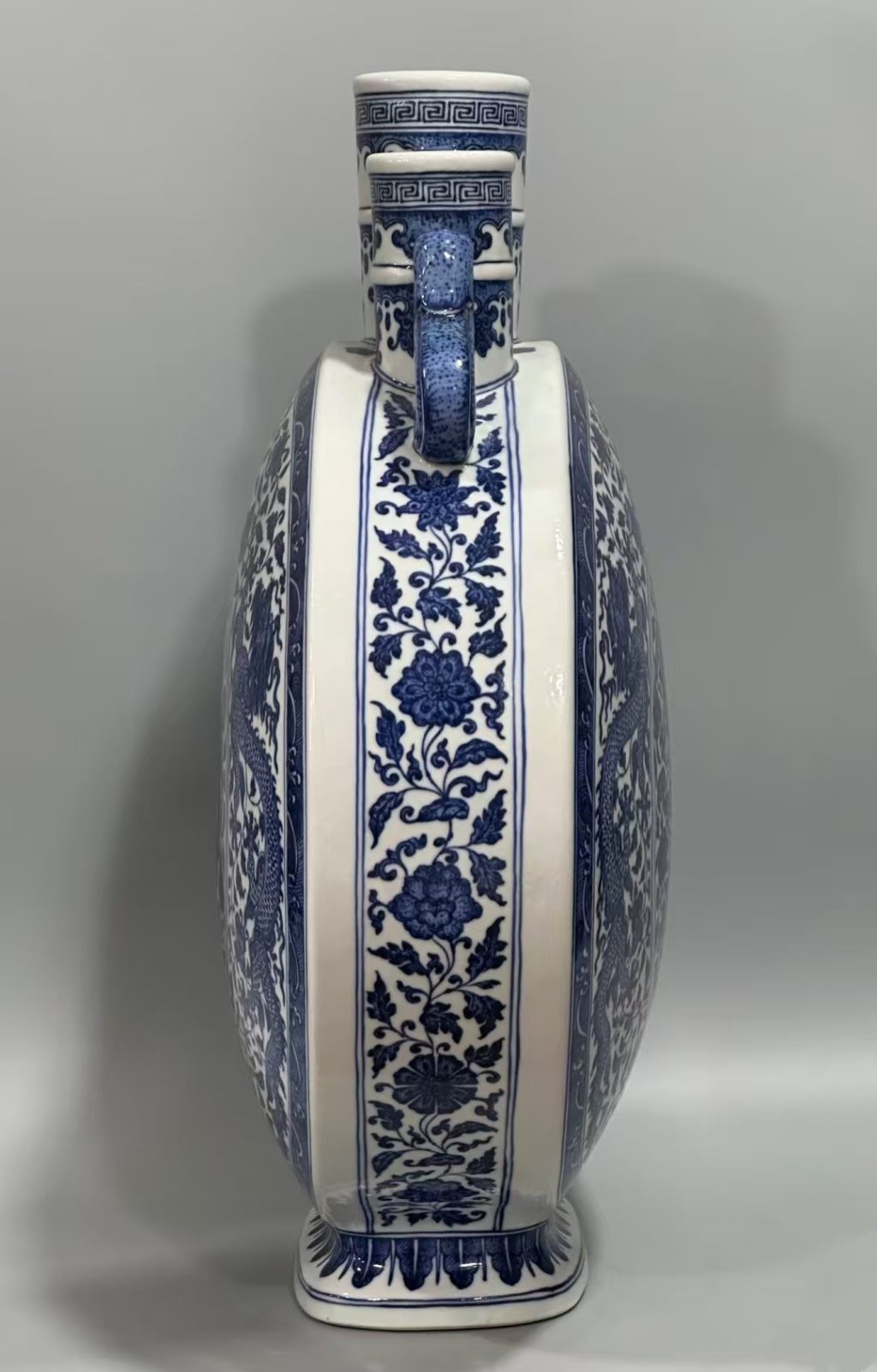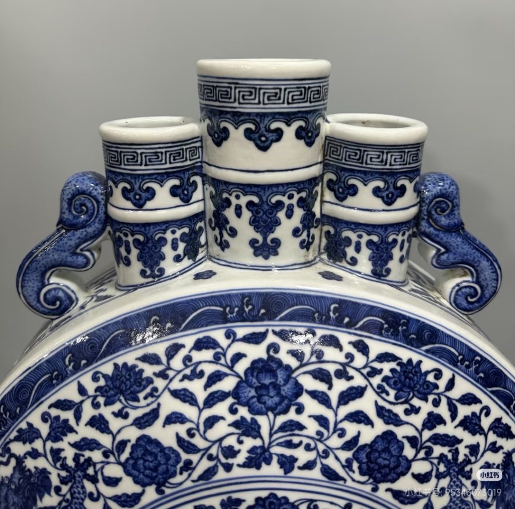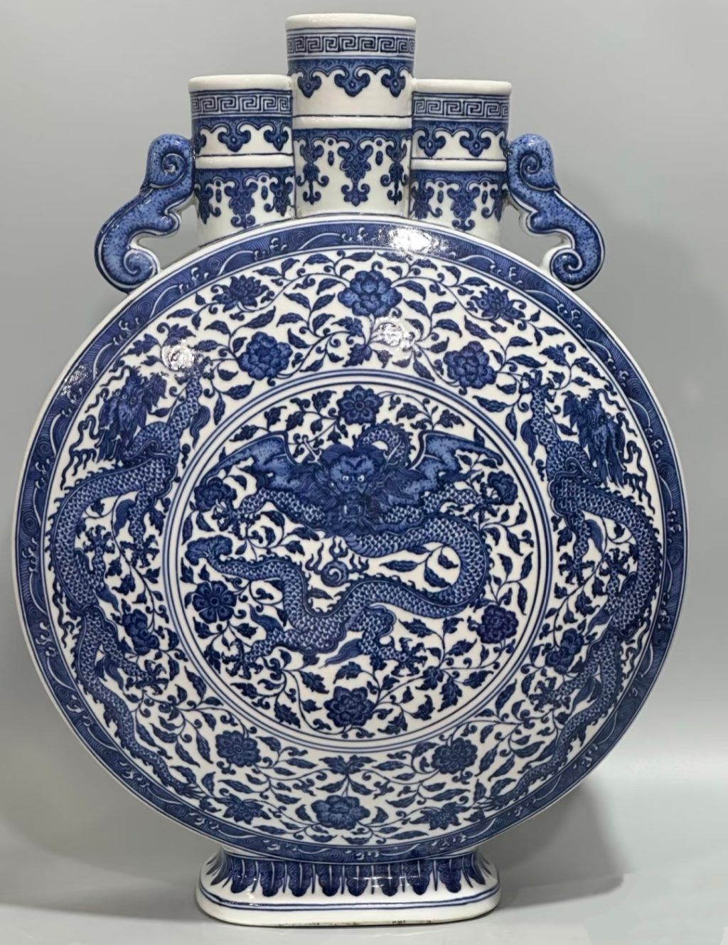 此瓶集乾隆御窯複雜工藝於一身:採用「二次燒成」技法,先燒素胎再施釉複燒,對窯溫火候的把控精度要求極高;獨特的三管設計打破傳統單口形制,既增強器型立體感,又考驗工匠成型與接續技藝;龍形雙耳線條流暢遒勁,與扁圓瓶身形成視覺平衡,細節處可見雕塑造型的精湛。瓶身釉面瑩潤如玉,青花繪製筆觸細膩,從器型比例到紋飾佈局,皆踐行乾隆御窯「無一處不精緻」的嚴苛標準。