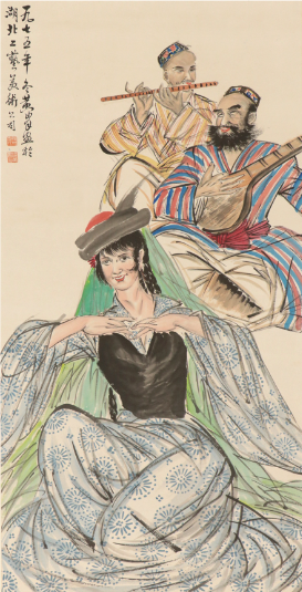 黃胄作為中國現代畫壇巨匠,其代表作《歌舞昇平圖》兼具藝術高度與歷史意義。從文物歷史價值來看,這幅作品不僅是黃胄藝術風格的集中體現,更折射出特定時代的社會風貌 —— 畫面以宴樂盛景為載體,舞者衣袂飄揚、歌者笑意盈盈,生動還原了盛世歡騰場景,為研究現代中國畫中「現實題材與傳統技法融合」的發展脈絡提供了重要實物依據,也承載著藝術家對生活情趣與社會理想的獨特表達,具有鮮明的時代印記與文化內涵。