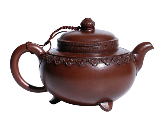 顧景舟以“形、態、氣、神”品壺,更以“真善美”為製壺圭臬——實用為善、細節為真、美感為美。《三足雲肩如意壺》作於其藝術成熟期,底款“宜興湯渡陶業生產合作社出品”佐證其為合作社初期經典。作品創意源自青銅三足圓鼎,紋飾融清代回紋與如意雲紋,既傳承青銅器的莊重氣度與傳統吉祥紋樣的文化內涵,又賦予紫砂文人氣質,成為20世紀紫砂藝術融合傳統與創新的典範,體現大師對工藝與文化的深度思考。