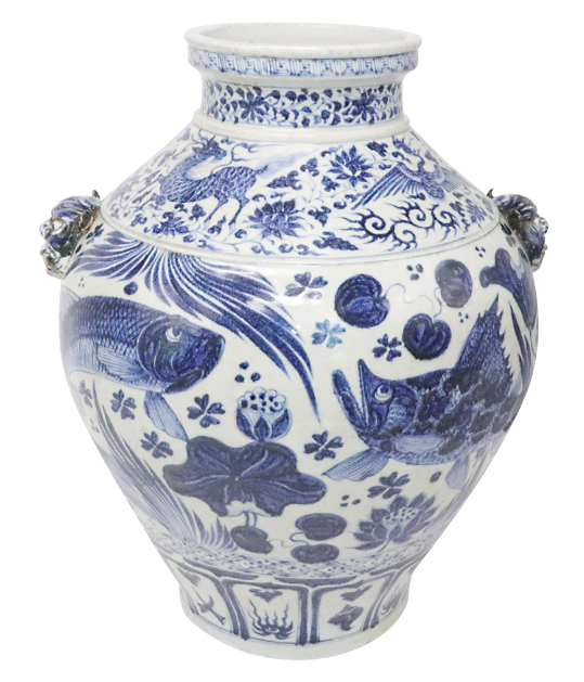 工藝上展現元代制瓷的巔峰水准:采用進口蘇麻離青料繪制,釉色濃艷深沉,青花暈散自然,呈現獨特的「鐵斑點」特征;魚藻紋繪制細膩,魚兒擺尾游弋,水草飄逸生動,筆觸流暢有力,兼具寫實與寫意之美。雙獸耳采用模印與手塑相結合的工藝,獸首張口怒吼,紋理清晰立體,與罐身主紋飾呼應,整器從胎土煉制到釉料燒制,每道工序皆嚴苛,體現元代工匠的高超技藝。