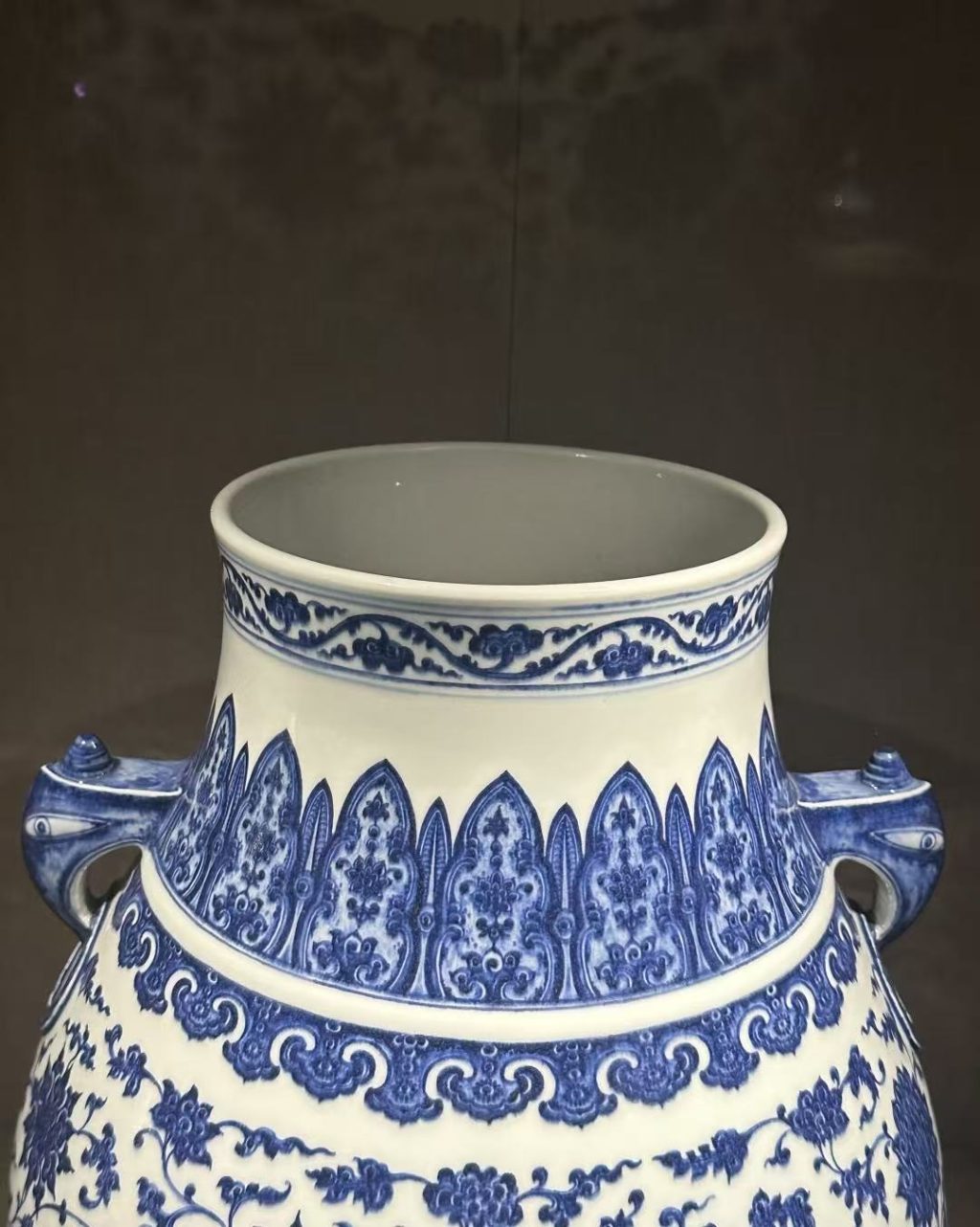 - 乾隆青花工藝標桿:本品採用仿明早期青花點染法,青花发色純正濃艷,庄重典雅中透着靈動。全器自口沿而下分六层纹饰,結構嚴謹對稱,筆力遒勁飽滿,纏枝花卉枝葉纏繞自然,花瓣輪廓清晰,蕉葉、如意雲等輔紋層次分明,完美展現乾隆官窯“精細秀雅、工藝極致”的風格。