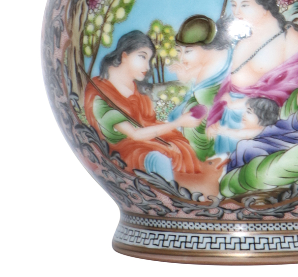 - 紋飾布局:腹部開光繪夕陽西洋人物故事,背面題詩,輔以立體施彩