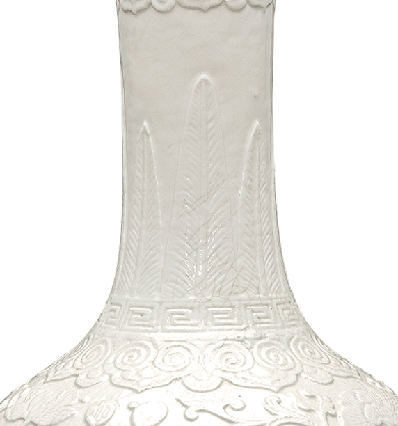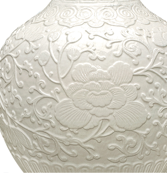 摹古出新的工藝極致:本品以宋代定窯白瓷為範本,胎釉燒製嚴循古法,釉色瑩潔如脂,再創天球瓶經典器型。模印凸花工藝精湛,紋飾層次分明,纏枝花卉枝葉纏繞自然,凸於器表的立體紋飾摩挲手感細膩,既還原定窯“白如玉、薄如紙”的韻味,又展現乾隆禦窯“精細秀雅”的獨特風格。