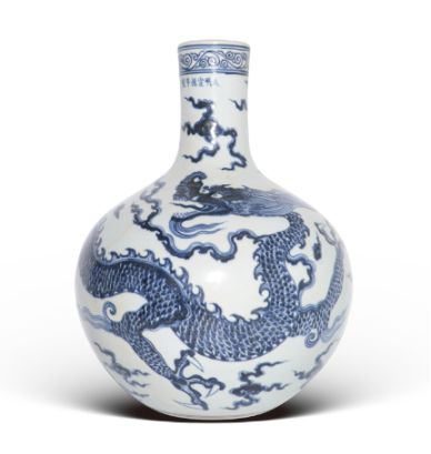 天球瓶寓意「天圓地方」,雲龍紋為帝王專屬,象徵皇權與「祥瑞昌隆」,是傳統禮制的凝聚。青花雲龍器始於元、盛於明清,天球瓶因器大燒造難、存世少,精品多藏故宮等機構,此瓶堪稱同類翹楚。