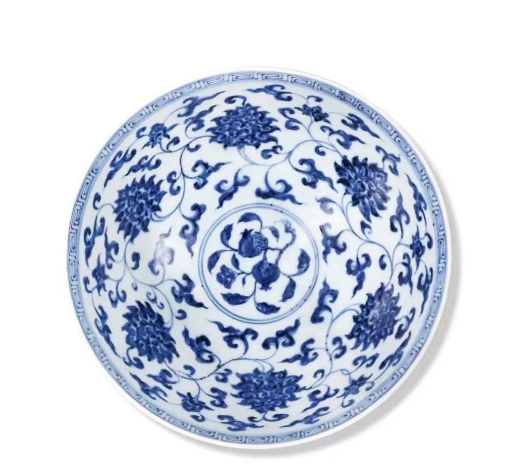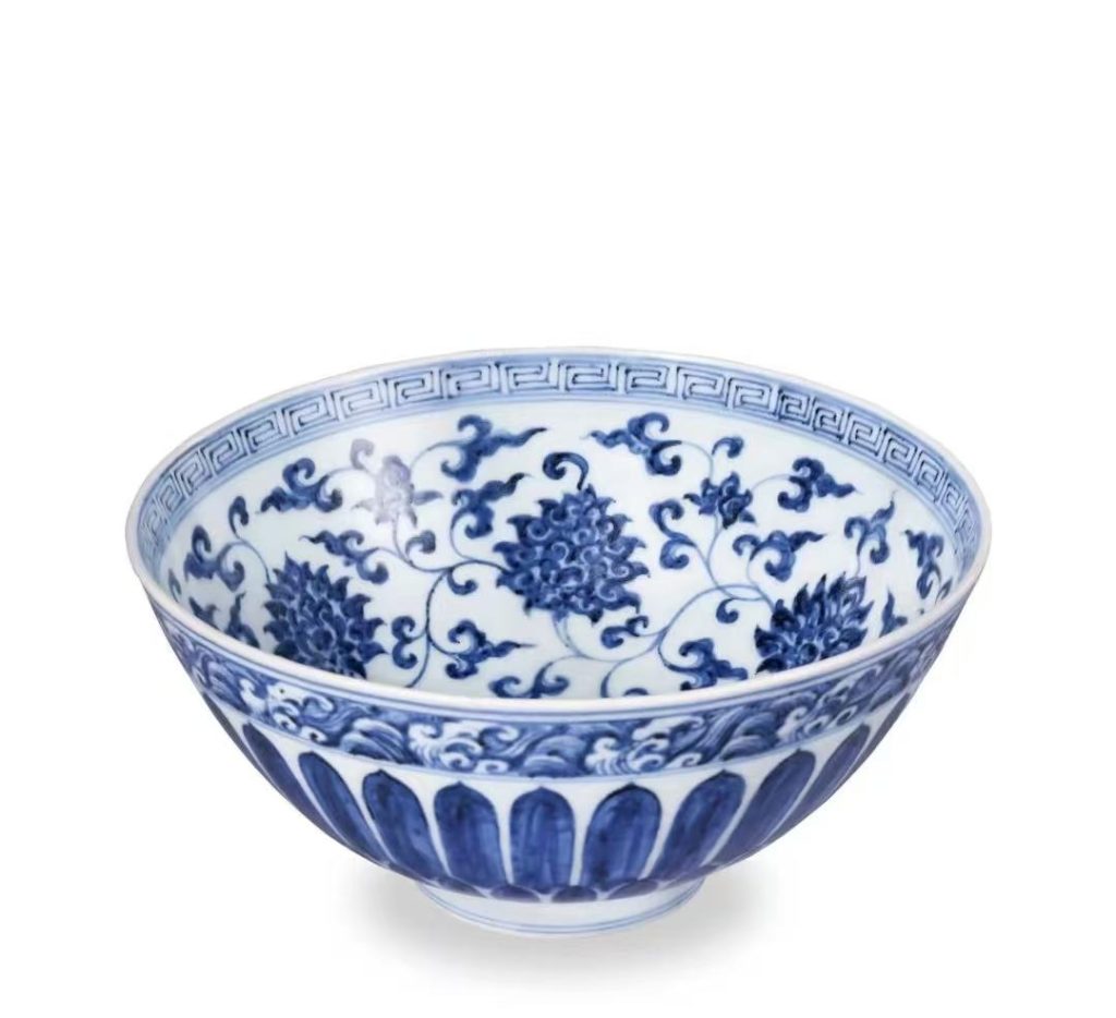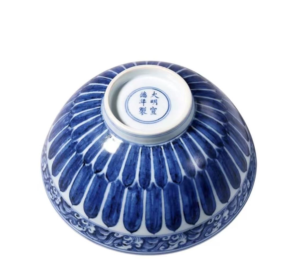 宣德一朝(1426-1435)雖僅十載,卻因宣宗皇帝對藝術的極致追求,鑄就中國陶瓷史的輝煌巔峰。《景德镇陶录》評其「諸料悉精,青花最贵」,許之衡《饮流斋说瓷》更稱「宣窯之美為有明一代冠」。這件青花内纏枝蓮外海浪菊瓣大碗,因碗心内凹如蓮房俗稱「蓮子碗」,正是宣德禦窯廠燒造的罕見精品,集造型、紋飾、工藝之大成,是時代審美與皇家氣度的生動載體。