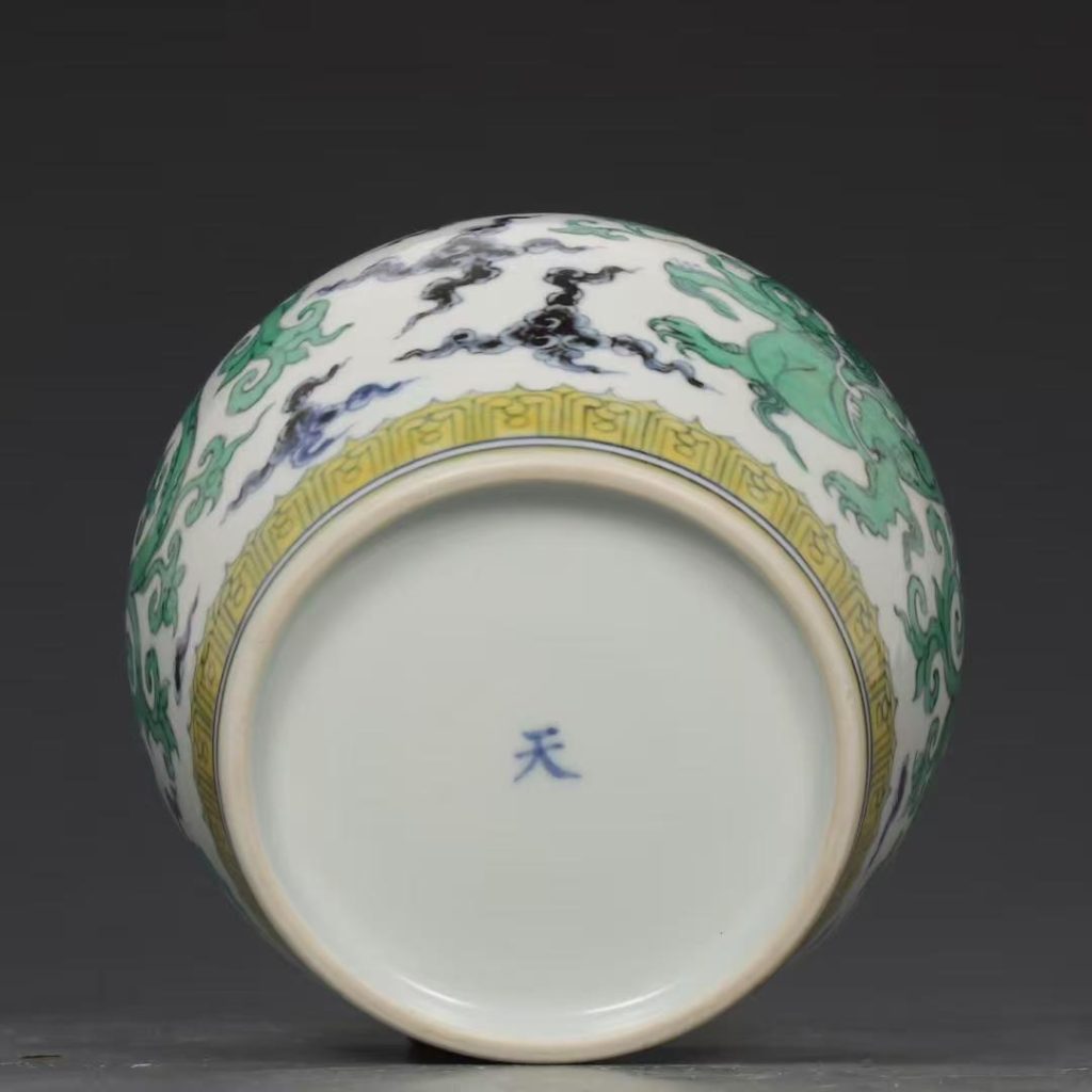 - :罐身主体绘夔龙纹,龙形线条婉转流畅,姿态灵动矫健,鳞片、龙须刻画细腻入微,祥云纹环绕其间,纹饰布局疏密有致。夔龙作为传统吉祥纹饰,象征皇权与祥瑞,与“天字罐”的皇家属性相得益彰,展现了明代宫廷的审美取向。