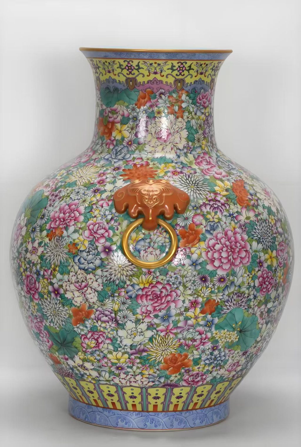 本次聚焦的清乾隆珐琅彩百花不落地大狮头大口瓶,属清代宫廷御制重器,尺寸规制堪称同类器型中的佼佼者:高60.5厘米,口径24.7厘米,肚径47厘米,底径26厘米。其器型设计兼具宏伟与精巧——撇口外敞彰显大气,鼓腹丰盈蕴含雍容,圈足稳健承载庄重,两侧对称的狮头铺首耳更是点睛之笔,狮首鬃毛卷曲、五官立体,既强化了器物的皇家威严感,又通过精湛的雕塑工艺提升了整体艺术层次,是乾隆朝珐琅彩瓷中「器型与装饰共生」的典型代表。