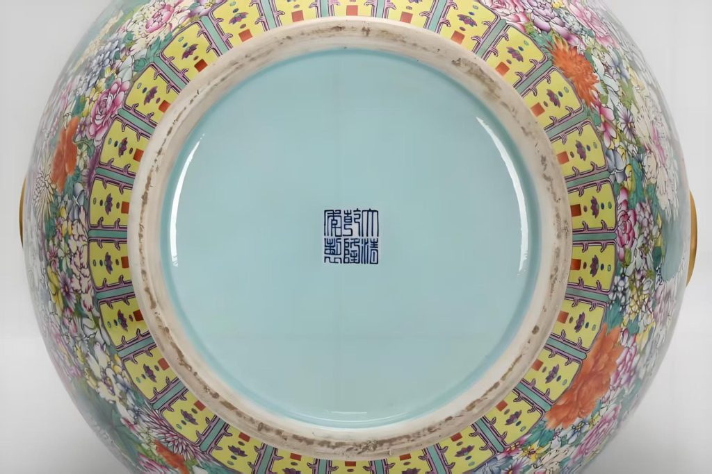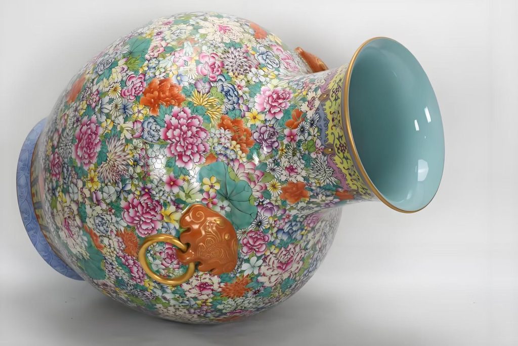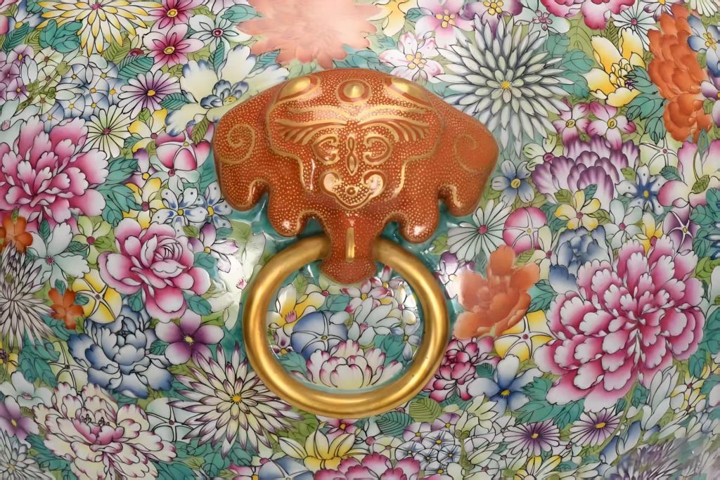 「百花不落地」又称「百花锦地」,需工匠以数十种进口珐琅彩料,在器身绘就数百朵不同品类的花卉,从牡丹、芍药到月季、山茶,花叶交错、不露胎底,形成「万花如绣」的视觉效果。这种繁复的装饰风格,不仅象征着「国泰民安、百花齐放」的盛世图景,更暗含「万国来朝、天下归心」的政治寓意,是乾隆时期国家实力与文化自信在瓷器上的直接投射,具有不可替代的历史文献与艺术象征价值。