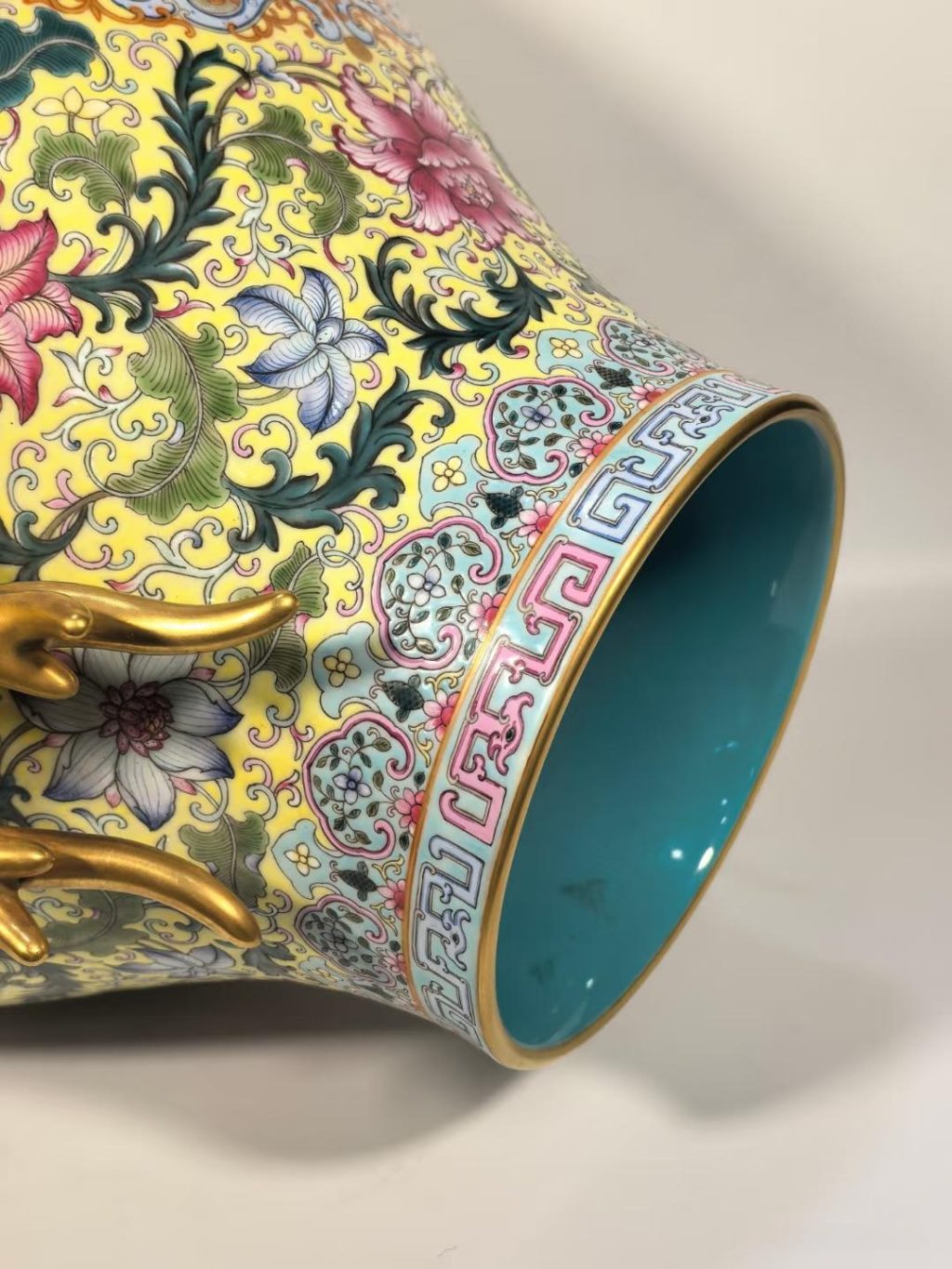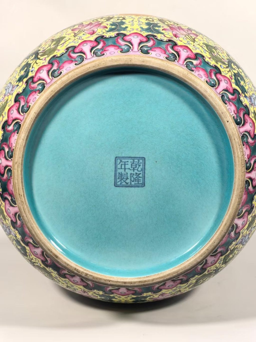 此尊在工藝細節上可謂「毫厘之間見真章」。胎體採用極為珍稀的「糯米胎」,選料僅取瓷土中最精細的部分,經反覆淘洗、揉煉,燒成後胎質潔白細膩,宛若糯米粉般瑩潤,輕叩之音清越悠揚;釉面施釉均勻,瑩潤如玉,與胎體緊密結合,形成「釉似凝脂」的質感;黄地釉料經特殊調配,色澤飽滿醇厚,金光璀璨卻不顯浮艷,體現了御窯廠對釉料配方的精准掌控;珐琅彩料來源於國外進口與國內研製相結合,色彩種類豐富,紅、藍、綠等色調飽和鮮亮,畫面暈染自然,層次感極強;開窗技法運用熟練,將主題花鸟紋與纏枝蓮地紋清晰分隔,既突出了主紋的精美,又使整器紋飾主次分明、和諧統一;底部「乾隆年制」四字楷書款識,筆法規整端莊,字體清秀有力,為典型的乾隆御窯款識風格,進一步印證了其皇家御用的珍貴身份。更為难得的是,經歷數百年歲月滄桑,此尊仍保持品相完好,無明顯損傷與修復痕跡,實屬罕見。