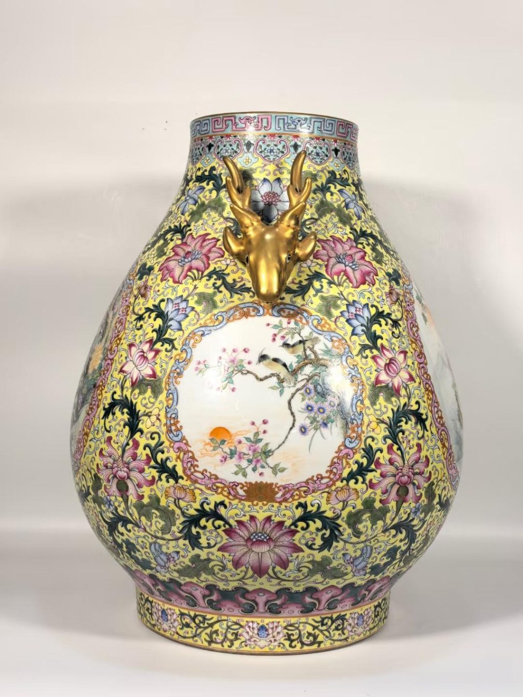 珐琅彩瓷又稱「瓷胎畫珐琅」,其燒製流程極為嚴苛:先由景德鎮御窯廠選取頂級瓷土燒製素胎,經嚴格篩選後運至京師内务府造辦處,由宮廷畫師参照院體畫風繪製紋飾,再以進口珐琅彩料施彩,最後經低溫二次燒成,全程耗時費力,成品率極低。此尊以皇家專用的明黃釉為地,釉色濃艷而不失沉穩;滿繪的纏枝蓮紋盤旋纏繞,線條流暢,寓含「富貴不絕、生生不息」的吉祥寓意;腹部兩面開窗繪製花鸟圖,畫中禽鳥姿態生動,花卉嬌艷欲滴,筆法細膩入微,兼具工筆畫的精緻與文人畫的韻致;雙耳採用圓雕鹿头造型,鹿角玲瓏,鹿目炯炯,工藝精湛,而「鹿」諧音「祿」,與黄地的皇權象徵、蓮紋的富貴寓意相呼應,構成「福祿富貴」的完整文化內核,是乾隆朝「紋必有意,意必吉祥」工藝理念的典範。
