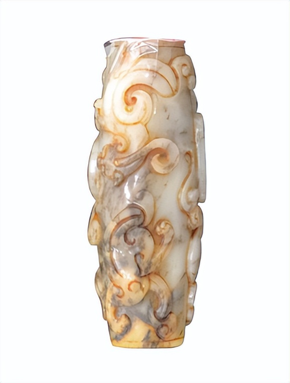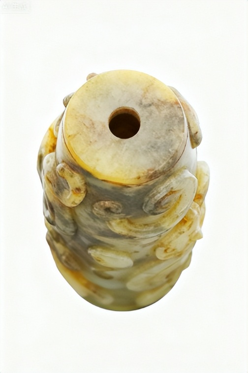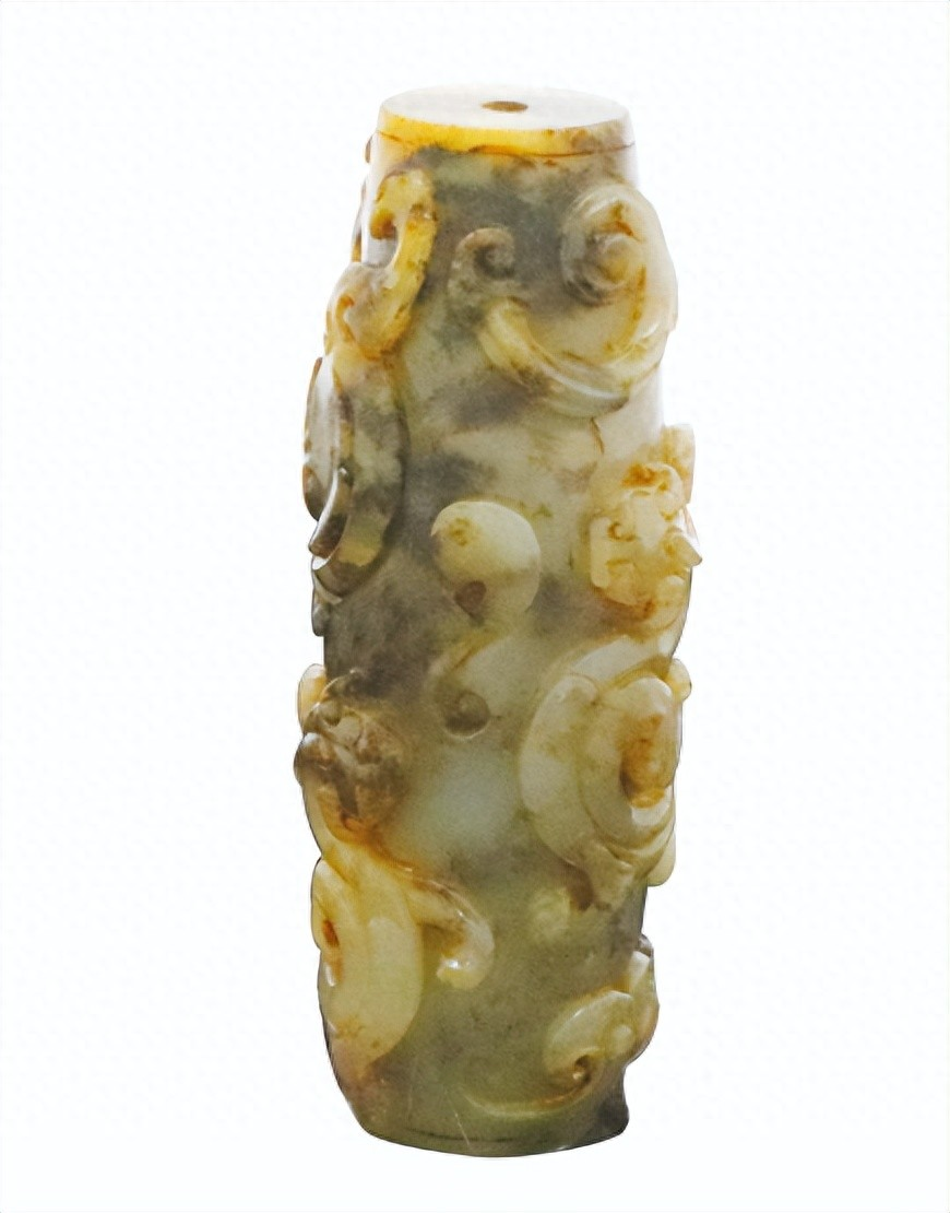 - 2022 年北京保利「高古玉及歷代玉器專場」,一件帶自然沁色的戰國青玉圓柱勒子,因沁色獨特、器形規整,以 RMB 485 萬落槌;