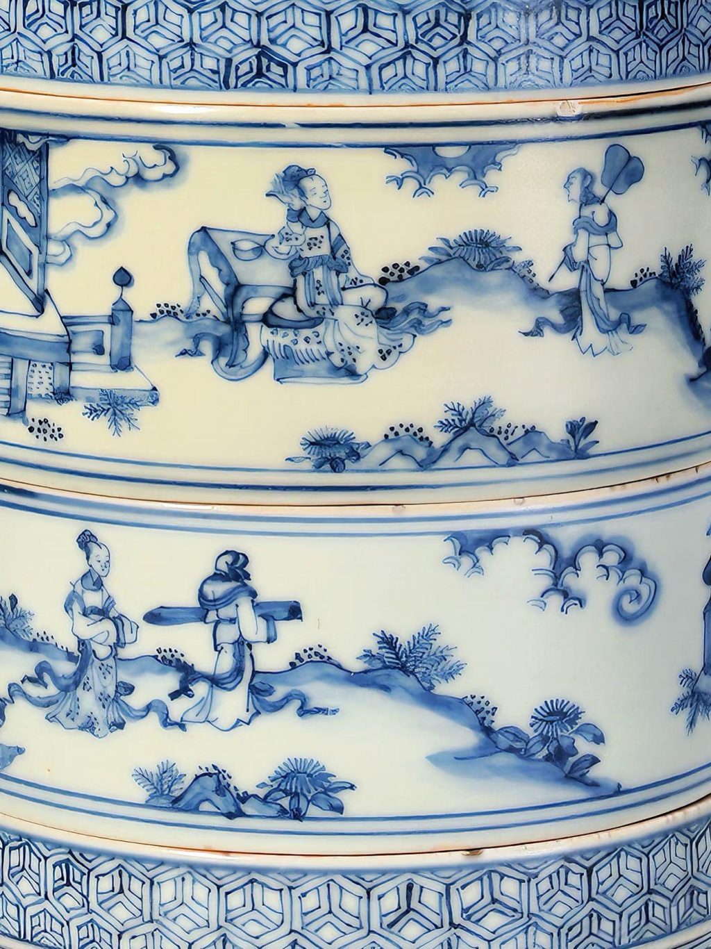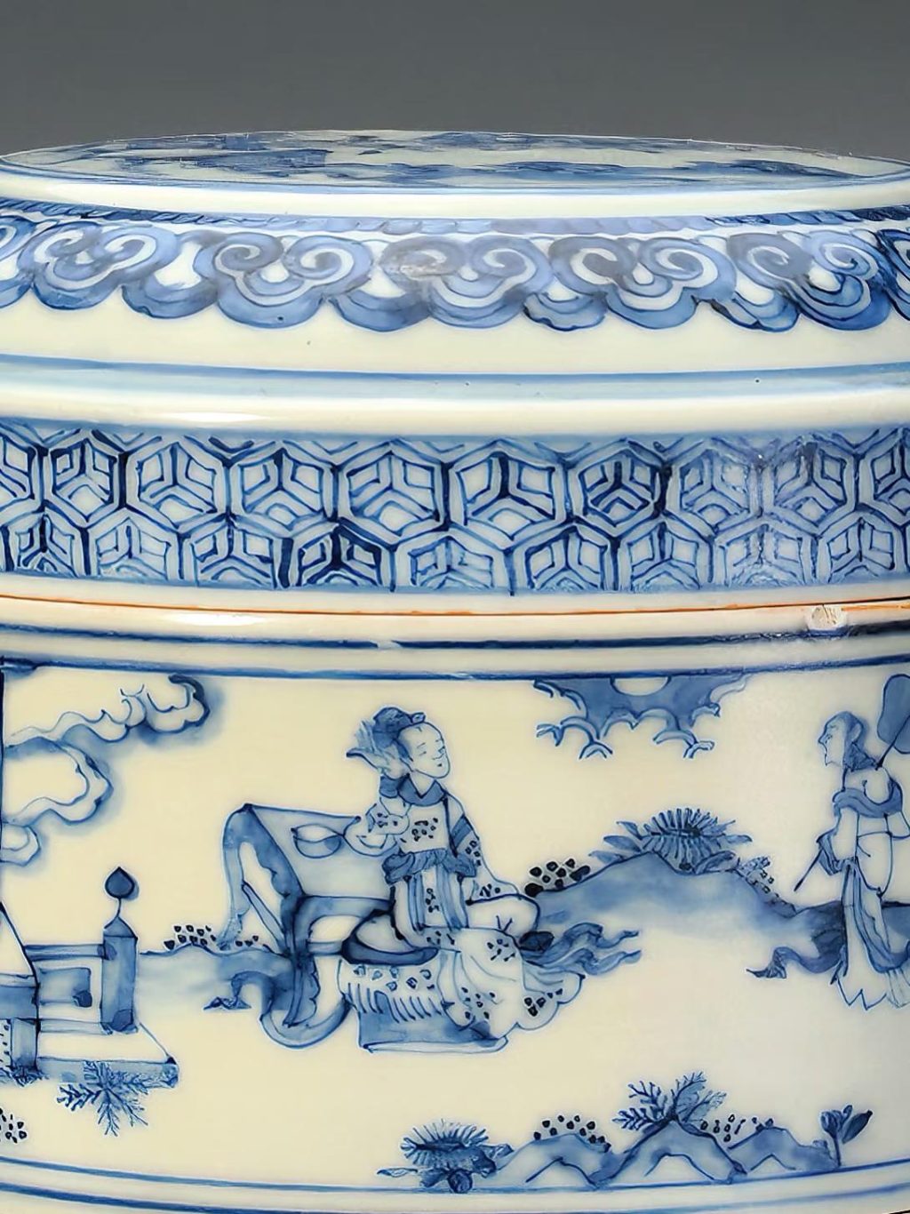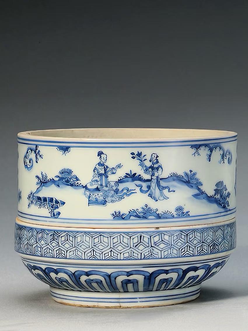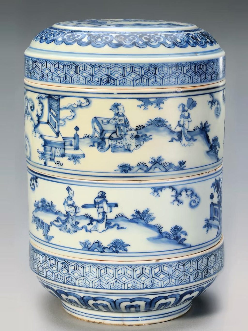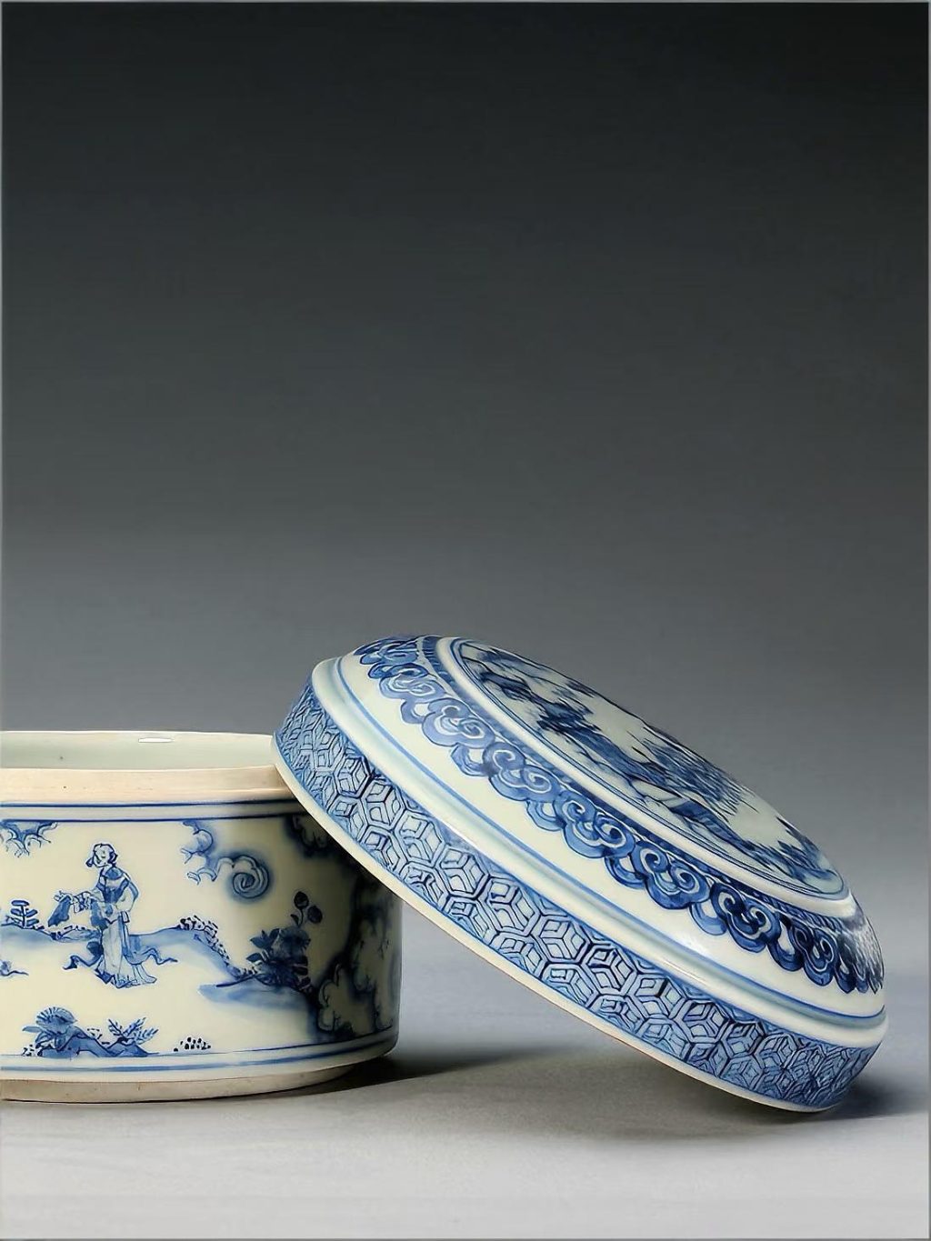 明代是中國青花瓷器發展的鼎盛時期,正德年間青花器物既承襲前朝工藝精髓,又形成獨特風格 —— 青花呈色濃艷明快,造型趨向秀麗端正,紋飾題材更注重生活化與故事性。這件青花人物圖套盒,恰是正德時期青花瓷藝的典型代表:雖人物間云氣紋尚存前朝遺風,但從青花呈色、器物造型上,清晰體現正德年間特徵,是研究明代中期青花工藝演變、社會文化審美的珍貴實物資料,且作為傳世套盒極為罕見,進一步凸顯其歷史稀缺性。