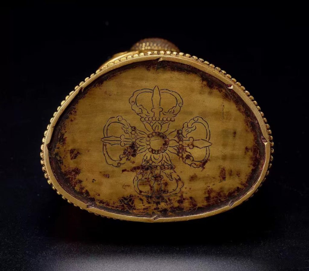 - 永宣造像的標誌性元素:佛像全跏趺坐於仰覆蓮台,蓮瓣飽滿瘦長、排列整齊,瓣尖卷起且線條富彈性,是「永宣造像」的核心識別點;台座前「大明永樂年施」款識,直接證明其宮廷來源。此外,黃銅封底以八個垛口加固,正中陰刻十字交杵圖案(加持標誌),表面殘留朱漆(尼泊爾流行的供養方式,元代傳入後被明代宮廷繼承),工藝細節處處體現「宮廷製作 + 文化融合」的特質。