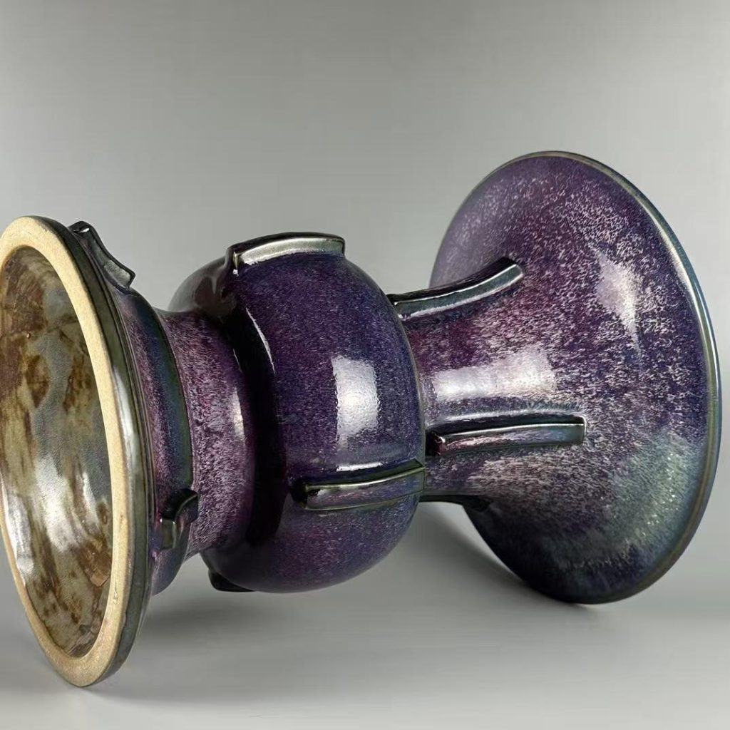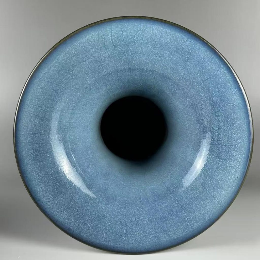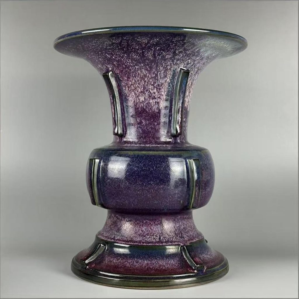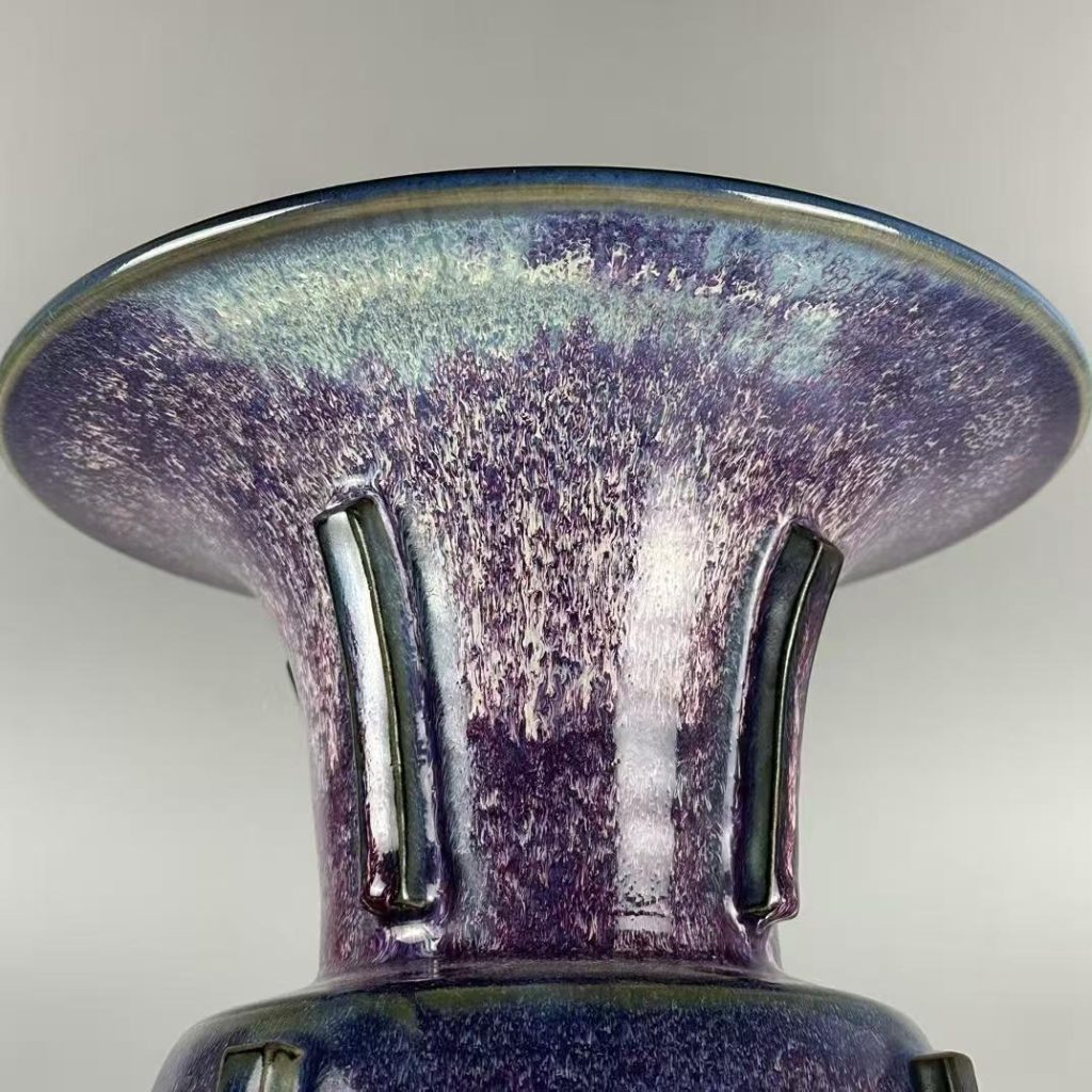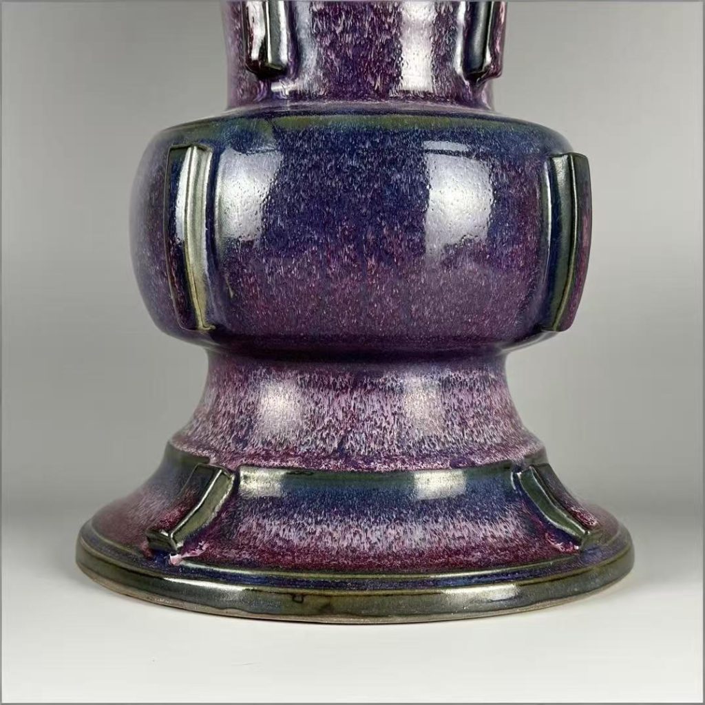 - 出戟尊的造型魅力:器物採用仿古出戟尊造型,口沿外撇、頸部收斂、腹部圓潤,器身凸起四道棱線(出戟),線條挺拔規整,無變形或歪斜。26 公分的高度與 18.5 公分的底徑,既保證器物穩固性,又凸顯出戟尊的莊嚴氣質 —— 大尺寸出戟尊燒制時易因受力不均導致棱線變形,本品能保持棱線清晰、器型對稱,足見北宋鈞窑對複雜器型燒制工藝的精湛水準。