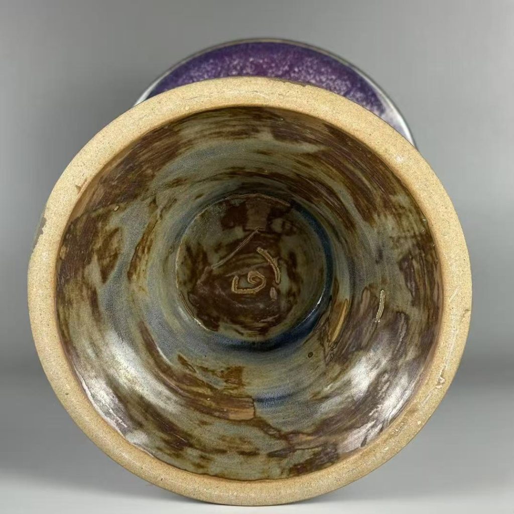 - 玫瑰紫釉的工藝奇蹟:尊身施玫瑰紫釉,釉色濃艷醇厚,紫中透紅、紅中泛藍,呈現出鈞窑特有的「窯變」效果 —— 因釉料中含銅元素,在高溫燒制中隨氣氛變化形成不規則的色釉流動紋,如晚霞映紫雲般絢麗,無兩件完全相同,體現「入窑一色,出窑萬彩」的鈞窑精髓。釉面瑩潤肥厚,開片均勻細密,無剝釉或漏釉現象,足見北宋工匠對釉料配比與窑火溫度的極致把控,這種玫瑰紫釉色在北宋鈞窑中存世量極少,可遇而不可求。