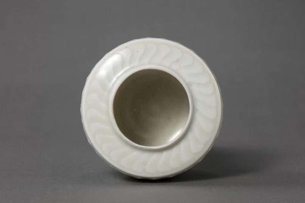此件北宋定窯白釉刻花蓮瓣紋蓋罐為成套保存,蓋作弧面出檐式,頂飾寶珠紐;罐身折肩鼓腹,腹下斜收至矮圈足,外壁滿飾凸脊蓮瓣紋,匠師以「兩刀一瓣」技法刻繪,紋路穩健、瓣棱明晰,俯視可見三重蓮瓣層層仰疊,宛如蓮荷盛開,尽显北宋定窯制瓷的精工巧思。
