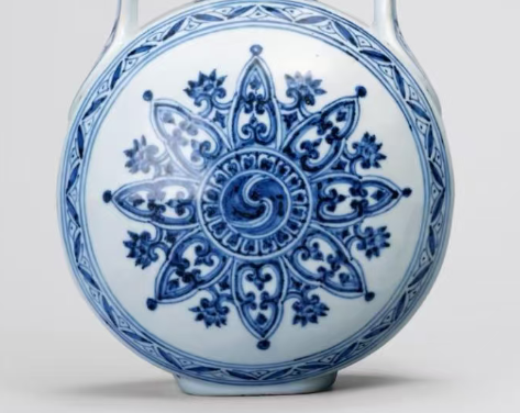 永樂青花以「蘇麻離青」料與獨特造型聞名,此件扁瓶可謂集大成者: