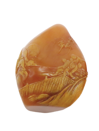 薄意雕以「薄」(0.5-1 毫米雕層)與「意」見長,《行舟牧歸圖》工藝精妙:石面左側淺刀刻扁舟漁翁,斗笠蓑衣、船槳衣褶見動態;右側牧童騎牛,手舉野果、牛背搭草簍,細節生動。舟旁蘆葦陰刻顯搖曳,遠山「披麻皴」現層次,下方碎線擬溪流,構成「水繞山行」之景;匠人保留田黃肌理作留白,如雲霧晴空,讓場景更開闊。