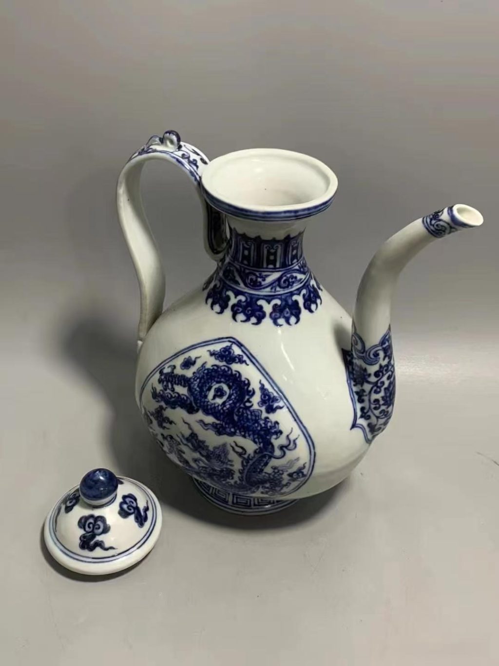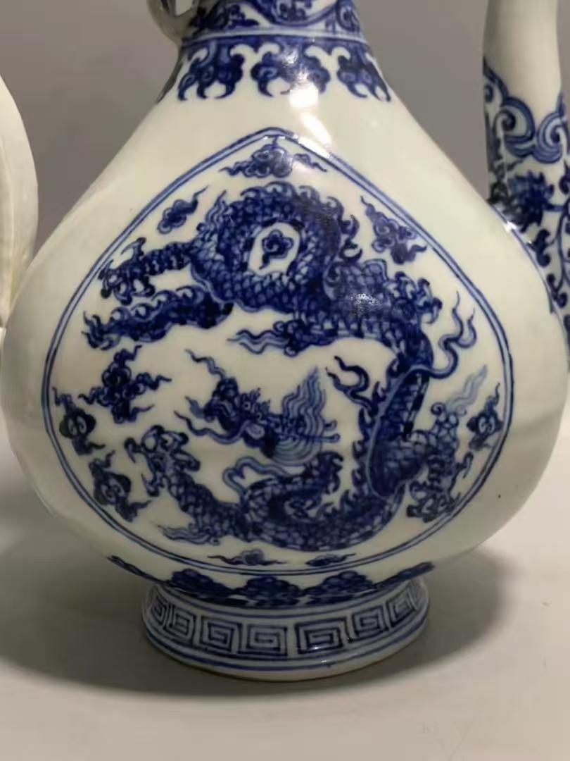 明代是青花酒器的盛行時期,酒壺不僅用於日常飲酒,更在宴飲、祭祀等禮儀場景中扮演重要角色。龍紋作為明代皇家與權威的象徵,廣泛應用於陶瓷器物,既體現統治階層的審美取向,也承載民間對「吉祥權貴」的嚮往。此件酒壺的龍紋繪製風格與青花特徵,可進一步佐證其具體年代(如永宣、成化或晚明),對還原明代不同時期的酒器規制與文化風尚具有重要參考意義。