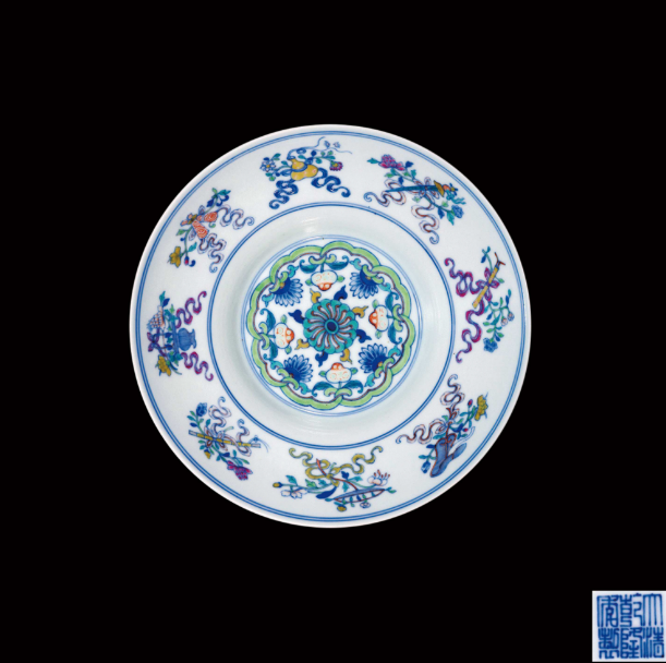 這件鬥彩八吉祥紋折腰盤,正是乾隆朝制瓷鼎盛的縮影:所用釉彩極其豐富,從青花的濃艷到釉上彩的絢麗,無一不顯用料考究;圖案繪畫耗費大量人力,從盤內複雜的月華錦紋到外壁多樣的折枝花卉,每一處細節皆經精心設計,可謂「不惜工本,不計人力」,盡顯乾隆一朝的繁榮氣象,是當時宮廷用瓷審美的典型代表。