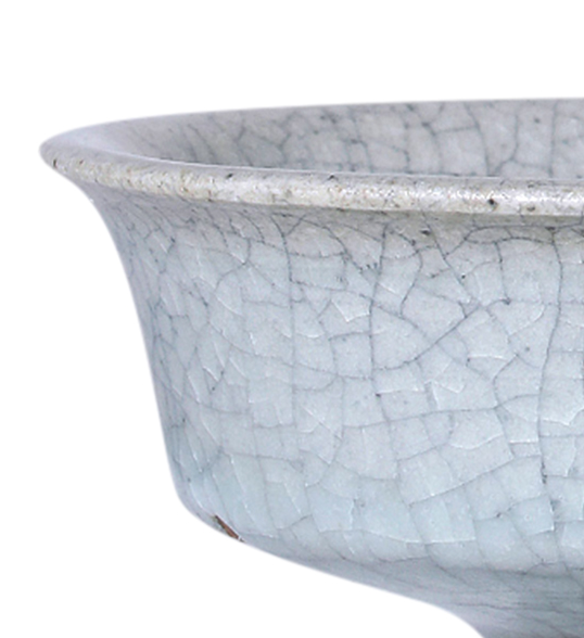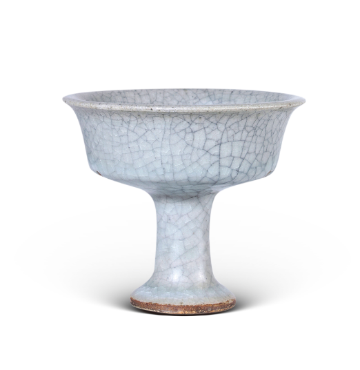 這件小高足杯正是元代哥釉瓷的典型代表:高足設計既符合元代飲茶、賞酒的生活習慣,又提升了器物的裝飾性;「金絲鐵線」開片雖不及宋代細膩,却多了一份豪放灑脫,與元代社會開放包容的氣質相契合。在元代瓷器中,哥釉小高足杯存世量極少,遠不及青花、青白瓷常見,因而更顯珍貴,是研究元代哥釉瓷工藝演變的重要實物。