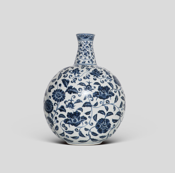 與永樂朝海浪刻白龍、雲龍穿花等扁壺相比,本品以四季花卉為題,融伊斯蘭器型、華夏工藝與多元紋飾,是明初 “和而不同” 宮廷美學的最佳詮釋。這件跨越六百餘年的珍品,見證永樂瓷藝輝煌,承載絲路文化記憶,無疑是拍場藏家競逐的核心目標,價值與意義將隨時間更為凸顯。