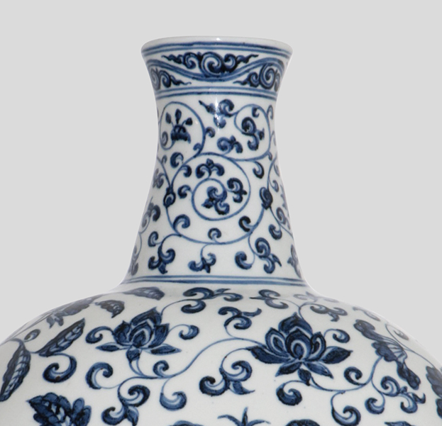 這件扁壺的青花魅力,源自珍貴的蘇麻離青料。此料產自波斯卡尚山區,由鄭和船隊經海上絲路帶回,發色幽藍深邃,滲青如水墨氤氲,飛白間隱現金屬結晶光澤,是伊斯蘭美學與中原匠藝融合的典範。鄭和遠航後此料漸絕,現已成為永宣青花鑒定核心標準,更显扁壺珍貴。