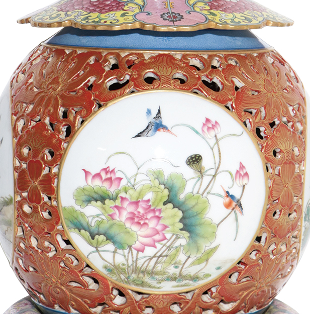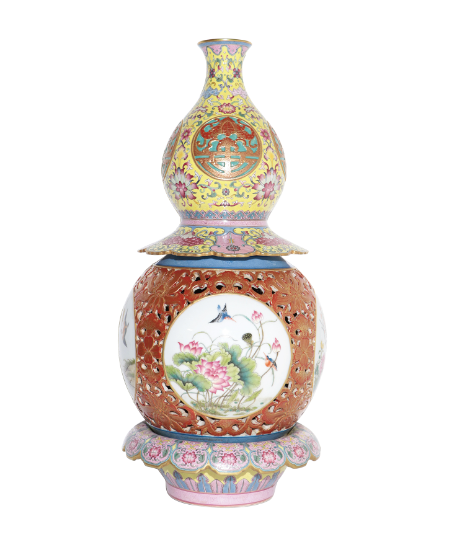 在清代雍正朝禦制瓷器中,各色釉洋彩鏤空開光蘆雁圖轉心葫蘆瓶可謂是集工藝之巧、美学之韵于一体的稀世珍品。此瓶以四截葫蘆造型为骨,融精細鏤空、機械轉心、豔麗洋彩于一身,瓶腹四面開光繪製的蘆雁圖更是点睛之笔,各元素相得益彰,製作工藝精湛绝伦,紋理清晰如生,堪称清代宮廷藝術的巅峰之作,