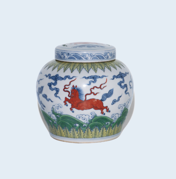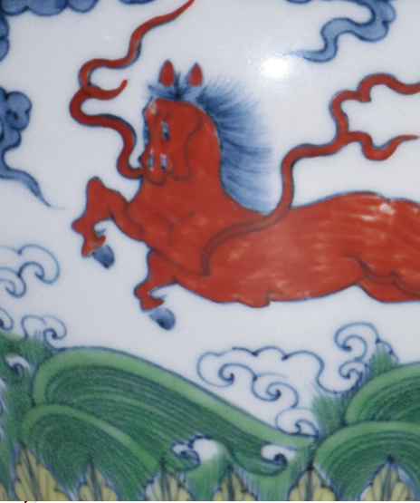 色彩運用上,此罐完美呈現了成化鬥彩的精妙。鮮紅如血的馬身、透明瑩潤的水綠雲紋、沉穩的孔雀藍海水、閃微紅的杏黃點綴,皆符合陶瓷鑒定專家孫瀛洲對成化彩的描述:「設色精當,素雅與鮮麗兼而有之」。畫面中海水洶湧、浪花飛濺,天馬於浪間騰躍,動態十足,釉下青花的濃淡與釉上彩的明麗交織,既顯明代藝術的濃情與活力,又藏文人式的清雅意境。