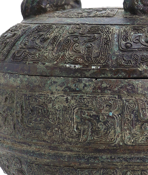 東周以後,周王室衰微,傳統青銅禮器從王權象徵的巔峰漸漸衰落,卻迎來了工藝創新的黃金時代。各諸侯國擺脫舊制束縛,開始打造帶有地方特色的器型與紋飾,審美也從商周的繁縟華麗,慢慢向簡約素淨過渡。這件青銅鼎便誕生於此時,既有對傳統的繼承,更有創新的突破 —— 蓋頂正中的火紋鮮明,週邊環繞繁密饕餮紋,蓋面與器腹近口沿處的饕餮紋內,又填滿精細幾何紋,疏密結合間,既保留了上古禮器的莊嚴感,又透出戰國時期的寫意韻味。