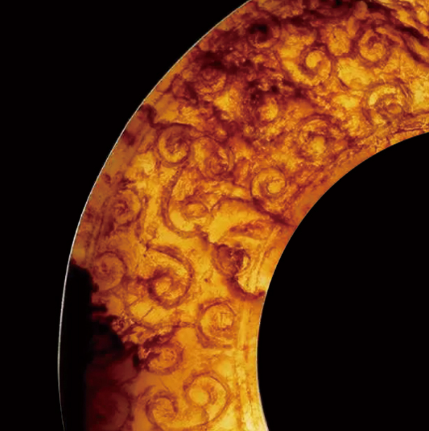 這件白玉紅沁穀紋環的工藝價值,在細節中體現得淋漓盡致。其器形為扁平圓環狀,玉質本為清潤白玉,歷經千年歲月浸潤,局部形成自然紅沁,色澤沉穩古雅,宛如歲月在玉上暈染的詩篇。內外緣精飾弦紋,線條挺拔流暢,勾勒出器物的輪廓之美;器表則佈滿經典的穀紋,這種紋飾是在飽滿的乳釘紋上加刻陰線而成,乳突勻稱飽滿,陰線刀工隨意而不失靈活,每一道刻痕都飽含力與美的張力,展現出強烈的生命力。整套刀工鋒利挺拔,無論是紋飾的佈局、玉質的選用還是雕刻技法的運用,都完全符合戰國時期玉器的典型特徵,可謂是那個「百家爭鳴、工藝勃興」時代的縮影。