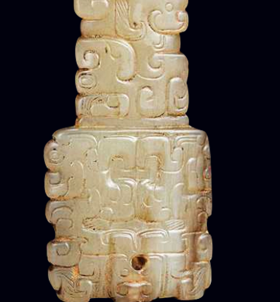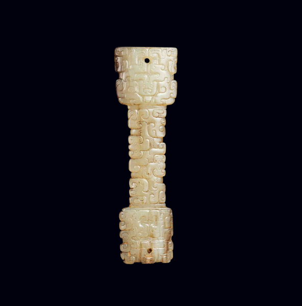 玉器在中華文明的長河中向來佔有尊貴地位,而春秋時期的玉饕餮紋劍柄,更是將實用器與工藝美、文化意蘊完美融合的珍品。這件劍柄造型獨特,雙面呈「工」字形,左右兩邊與底邊皆雕琢對稱齒脊,線條優美流暢,既兼具握持的實用性,又暗含春秋時期「對稱和諧」的審美追求。上段柄身圓厚飽滿,柄端上部對鑽圓孔,便於穿繩繫掛;下端接劍身處截出平地,背後砣出半圓形「銎眼」,用以穩固納入劍柄端,細節設計尽显古人的實用智慧。