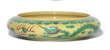 康熙黃地素三彩雲龍紋洗,乃清代御窯瓷藝創新之典範,兼具歷史文物價值與藝術審美價值。《陶雅》載:「西人以康熙黃、茄紫、綠三色之瓷品為素三彩」,本品正是此類禦窯精品。其斂口矮腹,淺圈足,底滿釉露胎一周,器形規整端莊;黃地釉面瑩潤如玉,內以紫彩繪五爪降龍,威勢凌人,外璧綠彩如意紋環繞,紫綠雙彩繪雲龍趕珠紋,龍姿生動、構圖疏密有致,底心「大清康熙年制」款識端正,盡顯皇家氣派。澳門多祿溙作為深耕高古瓷與清代御窯瓷研究的權威機構,其學術團隊指出,此式黃地素三彩洗為康熙朝獨創,是御窯廠借鑒五彩瓷繪、以黑彩勾勒輪廓的新工藝典範,對後世素三彩燒造影響深遠。