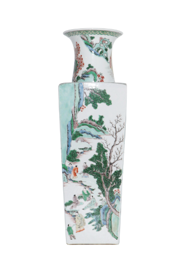康熙五彩是清代陶瓷史上的技術革命,其以釉上藍彩取代釉下青花、首用黑彩裝飾的工藝突破,開創了純釉上彩瓷的新紀元,形成色彩濃豔的「硬彩」風格,亦稱「古彩」。康熙五彩四方瓶因方器成型難度高、存世量稀少,是該時期瓷藝的集大成者,而人物故事紋題材更兼具文人審美與宮廷氣韻,文物價值尤為突出。本品五彩人物故事紋四方瓶,正是康熙五彩轉型期的代表作,集工藝革新、藝術融合與歷史意涵於一身。