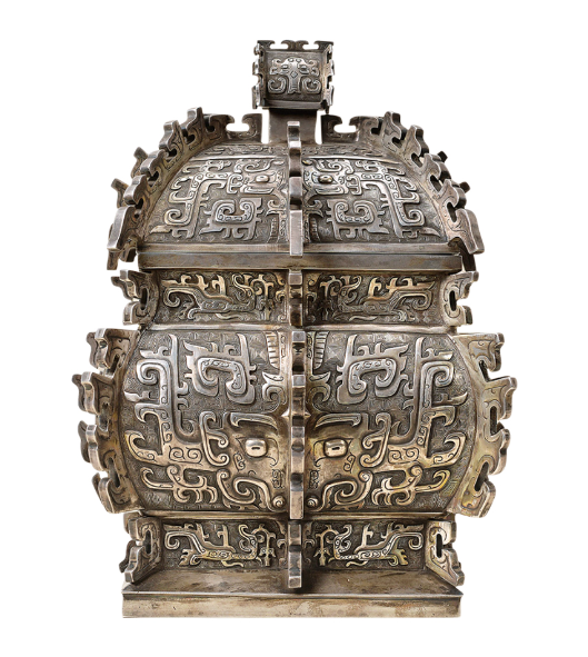 方彝為商周青銅禮器中的「重器」,專司祭祀盛酒,是上古禮樂文明的物質載體。此銀彝嚴循古制: • 整器造型:長方形侈口,器腹微鼓,圈足外撇,穩重中蘊含張力; • 經典「出戟」:器身四角與蓋部凸起扉棱,翹起如卷雲翻滾,還原青銅器的立體裝飾風格; • 屋頂形器蓋:佔整器三分之一,四坡屋頂式設計,以扉棱為脊(1條正脊+4條斜脊),正脊中間立屋頂形鈕,宛如上古宗廟微縮,完美詮釋「器以載道」的傳統理念。