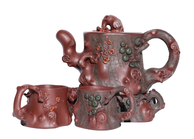 套壺在造型設計上可謂巧奪天工,每一处細節皆暗藏匠心: • 整體姿態:下略寬向上略修,向前微傾的勢態打破常規對稱,弧度緩和的曲姿則巧妙平衡不穩定感,呈現出自然生動的動態美; • 主體構成:以一截樹幹為壺身主體,朱紅與暗紅色釉色彌散交融,模擬樹木年輪與肌理的自然質感,樸實中見精緻; • 裝飾細節:梅枝彎曲成壺把,蓋沿疏落點綴幾朵梅花,無誇張雕琢的紋路與樹結,盡顯「清水出芙蓉」的雅緻;綠松果、褐松枝疏鬆散落於壺身,色彩對比鮮活巧妙,生意盎然;曲幹壺把與粗枝化成的壺咀暗相呼應,整體協調統一。