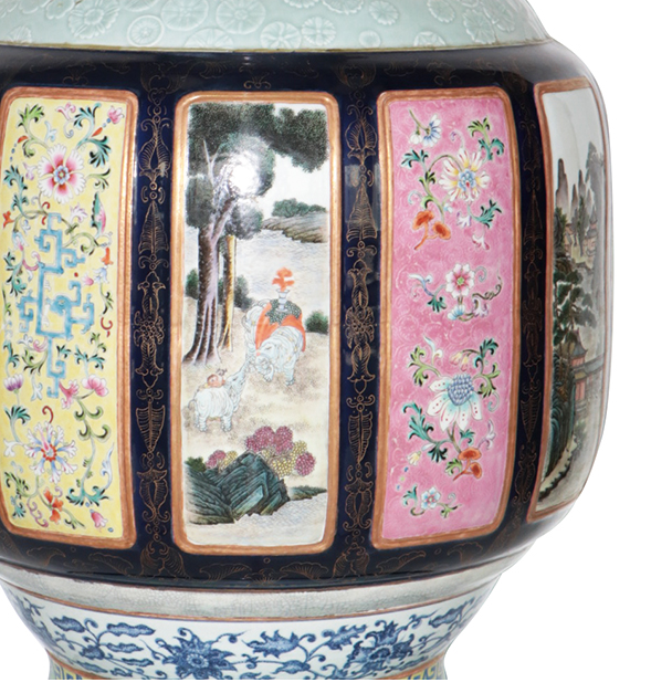 ▪️「冷熱交替」的燒制難題:器身融合高溫與低溫釉彩——青花、仿官汝哥釉、窯變釉等需先經1300℃高溫焙燒,粉彩、琺瑯彩、金彩等又需後續800℃低溫燒製,每一次窯火都如「走鋼絲」,稍有溫度偏差便前功盡棄。 ▪️「萬彩歸一」的釉彩組合:自上而下佈滿金彩、琺瑯彩、粉彩、青花等釉上釉下彩,搭配仿哥釉、松石綠釉、霽藍釉等10餘種釉色,僅腹部12個霽藍描金開光就包含寫實畫與吉祥紋,釉彩層次錯落卻毫無雜亂感,技藝複雜度空前絕後。